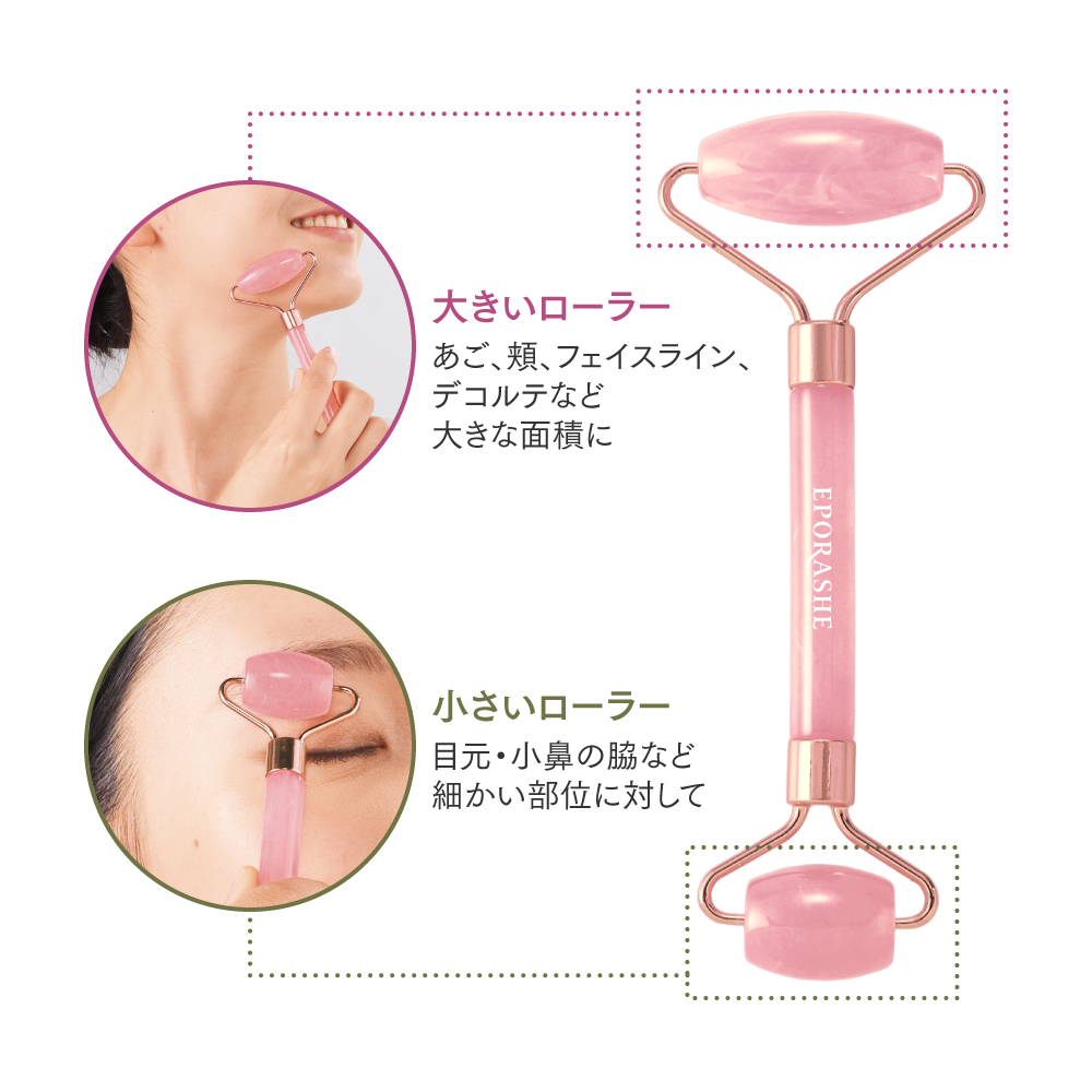 大きいローラーはおでこや生え際・フェイスラインなどの面積の大きな箇所に、小さいローラーは小鼻の横などの細かな部分へご使用いただけます。