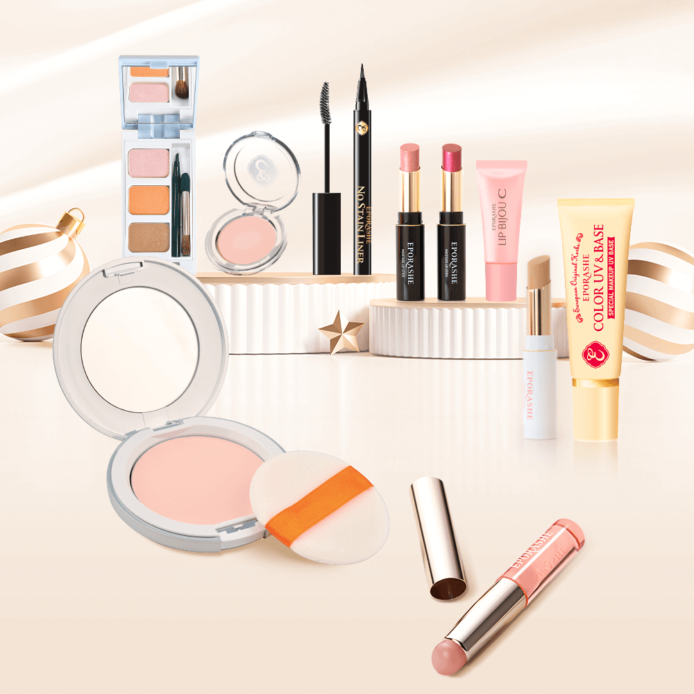カラーUV&ベース45g(定価:7,700円)、カラーUV&ベース30g(定価:5,830円)、トランスルーセントパウダー20gセット(定価:5,170円)、マイクロフィニッシングパウダーセット(定価:5,060円)、アイシャドウ3色ケース(定価:660円)、チップブラシ(定価:396円)、アイシャドウベース(定価:1,870円)、ノーステインライナー(定価:2,860円)、ピュアアイラッシュ(定価:3,410円)、モイスチャーリップスティック ピンクベージュ(定価:4,180円)、モイスチャーリップスティック リッチレッド(定価:4,180円)、リップビジューC(定価:2,310円)、マジカルシーラー(定価:3,630円)、エポラーシェロゴ入りシリコンメイクブラシ