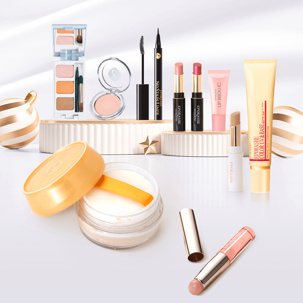 カラーUV&ベース45g(定価:7,700円)、カラーUV&ベース30g(定価:5,830円)、トランスルーセントパウダー20gセット(定価:5,170円)、マイクロフィニッシングパウダーセット(定価:5,060円)、アイシャドウ3色ケース(定価:660円)、チップブラシ(定価:396円)、アイシャドウベース(定価:1,870円)、ノーステインライナー(定価:2,860円)、ピュアアイラッシュ(定価:3,410円)、モイスチャーリップスティック ピンクベージュ(定価:4,180円)、モイスチャーリップスティック リッチレッド(定価:4,180円)、リップビジューC(定価:2,310円)、マジカルシーラー(定価:3,630円)、エポラーシェロゴ入りシリコンメイクブラシ